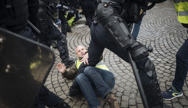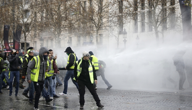 Διαδηλωτές με τα κίτρινα γιλέκα γέμισαν τους δρόμους γύρω από την Αψίδα του Θριάμβου στην γαλλική πρωτεύουσα. Με συνθήματα “Μακρόν παραιτήσου!” οι διαδηλωτές επιχείρησαν να σπάσουν τα μπλόκα και να πλησιάσουν το Προεδρικό Μέγαρο. Ωστόσο η απώθηση ήταν βίαιη με χρήση δακρυγόνων και νερό από τις “αύρες”.