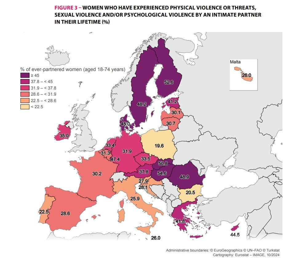 Το ποσοστό βίας από σύντροφο (σωματική βία ή απειλές, σεξουαλική βία και/ή ψυχολογική βία) κατά τη διάρκεια της ζωής κυμαίνεται από 54,6% στην Ουγγαρία, 52,6% στη Φινλανδία και 50,8% στη Σλοβακία έως 22,5% στην Πορτογαλία, 20,5% στη Βουλγαρία και 19,6% στην Πολωνία.