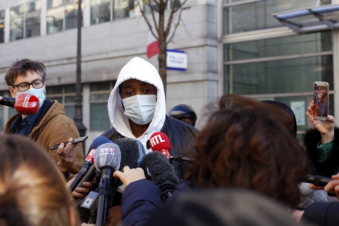 Στις εικόνες διακρίνεται ο άνδρας να ξυλοκοπείται από αστυνομικούς στην είσοδο ενός στούντιο μουσικής στο Παρίσι.