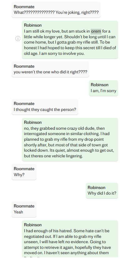 «Αν μου δοθεί η ευκαιρία να βγάλω από τη μέση τον Τσάρλι Κερκ, θα την εκμεταλλευτώ» έγραφε στο σημείωμα ο Ρόμπινσον, όπως αναφέρει η Telegraph. Όταν το διάβασε η συγκάτοικος, τον ρώτησε αν αστειεύεται.