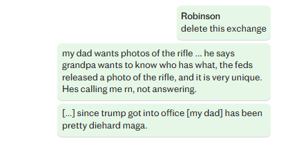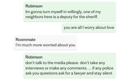 Στα μηνύματα που αντάλλαξε ο Τάιλερ Ρόμπινσον με τον συγκάτοικό του, μετά τη δολοφονία του Τσάρλι Κερκ, κυριαρχεί το άγχος του να καταφέρει να πάρει πίσω την καραμπίνα του, ώστε να μην υπάρχουν αποδείξεις σε βάρος του.