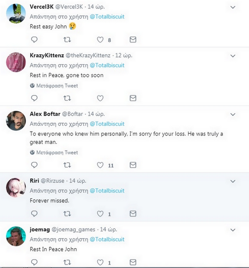 Η απώλεια του TotalBiscuit, προκάλεσε αντιδράσεις και στα τα μέλη της κοινότητας παιχνιδιών, συμπεριλαμβανομένου και του επίσημου καναλιού Fortnite. “Λυπάμαι τόσο πολύ για την απώλειά σας”, ανέφερει ο επίσημος λογαριασμός Twitter του παιχνιδιού, απαντώντας στο ποστ της γυναίκας του, Τζέμα.