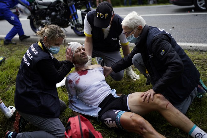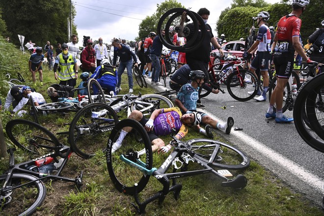 Πολλά ήταν τα ποδήλατα που έπαθαν ζημιές από τη πτώση, ωστόσο ο αριθμός των αθλητών που τραυματίστηκαν δεν έχει γίνει ακόμα γνωστός.