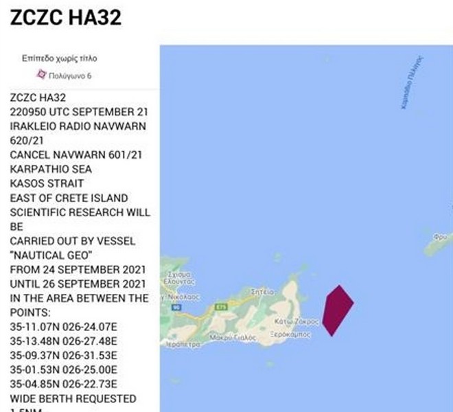 Όσον αφορά την περιοχή ερευνών του NAUTICAL GEO είναι ίδια με την περιοχή της ΝΑVTEX 601/21 της Υδρογραφικής Υπηρεσίας του ΠΝ, της οποίας η ισχύς έληξε την Τετάρτη. Το πλοίο κατέπλευσε στο λιμάνι του Ηρακλείου για ανεφοδιασμό, προκειμένου να συνεχίσει τις έρευνες την 24 Σεπτεμβρίου.