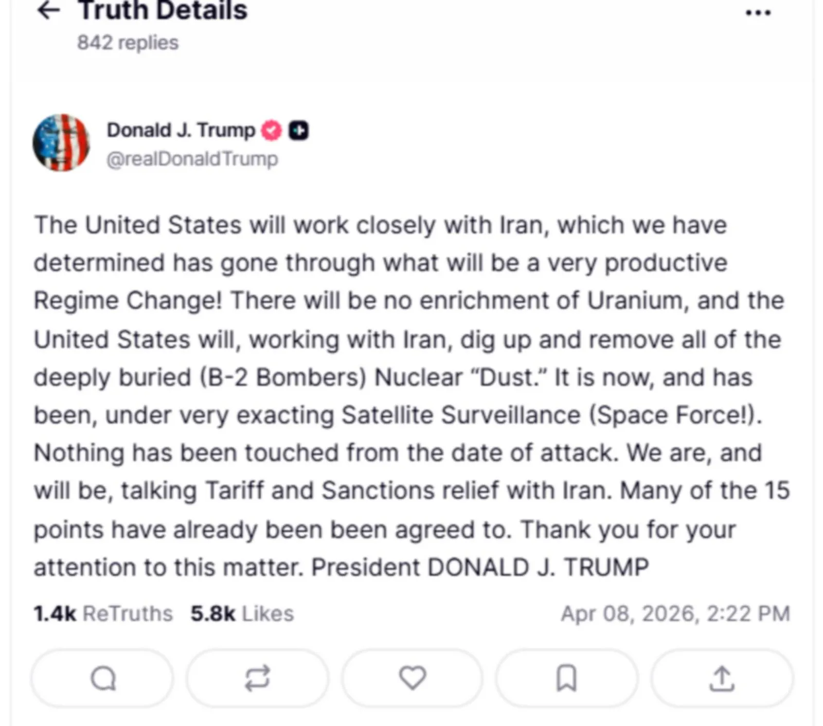 Σε ανάρτησή του στο Truth Social υποστήριξε ότι το Ιράν «έχει φτάσει στα όριά του» και ανέφερε ότι οι ΗΠΑ θα βοηθήσουν με τη συμφόρηση στη ναυσιπλοΐα στα Στενά του Ορμούζ και ότι «θα δημιουργηθούν μεγάλα οικονομικά οφέλη» καθώς το Ιράν ξεκινά την ανοικοδόμηση.