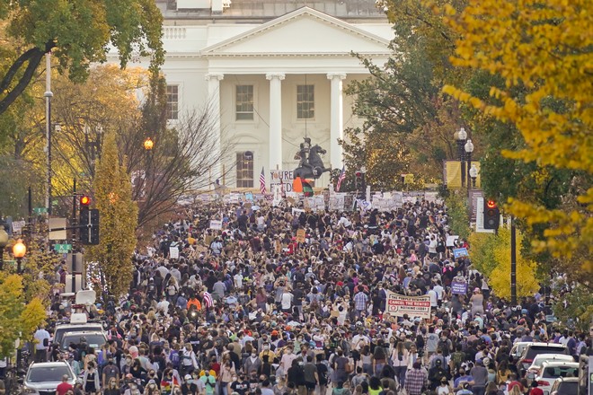 Την ίδια στιγμή, το σκηνικό γύρω από τον Λευκό Οίκο ήταν καθόλα γιορτινό, αφού υποστηρικτές του Μπάιντεν είχαν συγκεντρωθεί στην περιοχή για να γιορτάσουν τη νίκη του Μπάιντεν.
