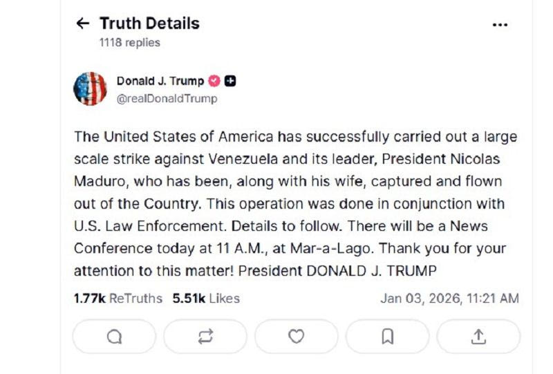 Μέσω ανάρτησης στο Truth Social, ο Αμερικανός πρόεδρος ανέφερε ότι ο Μαδούρο συνελήφθη ενώ βρισκόταν μαζί με τη σύζυγό του και πως και οι δύο μεταφέρθηκαν εκτός Βενεζουέλας.