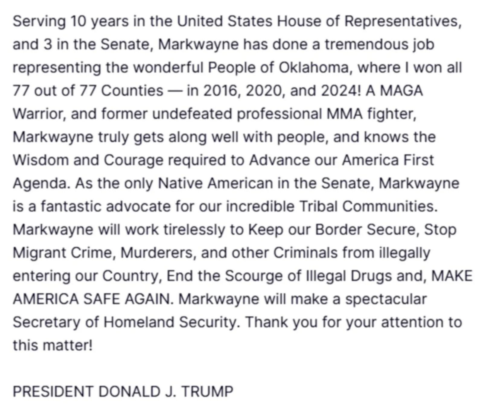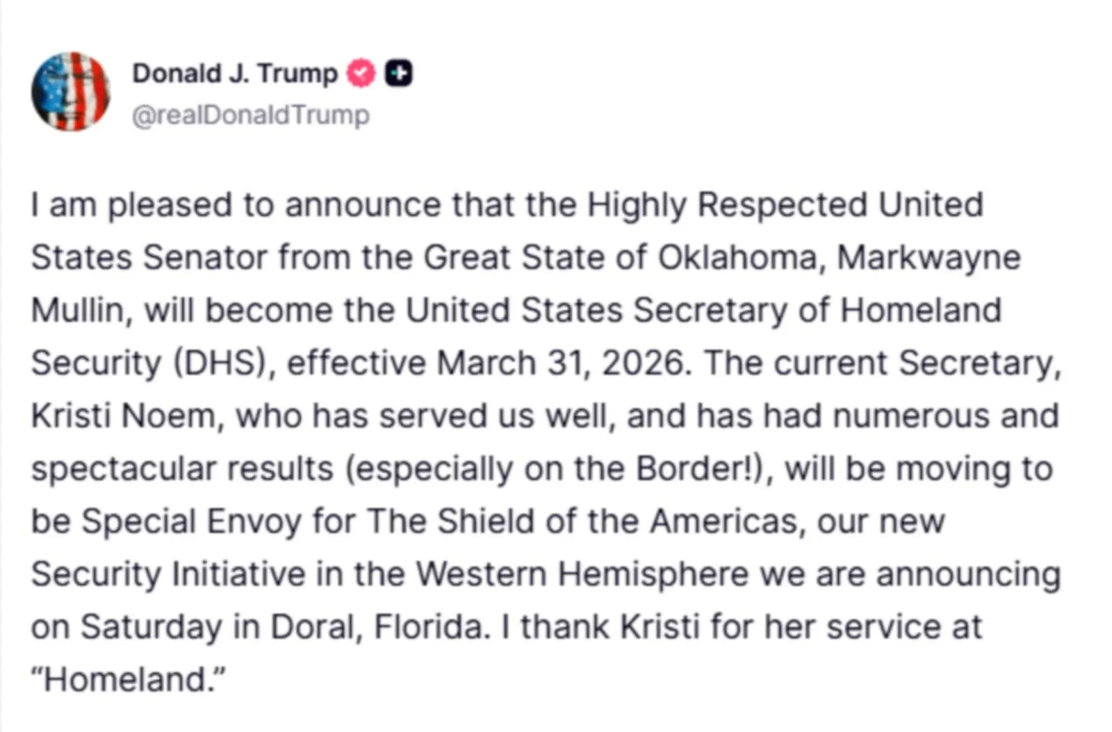 “Με χαρά ανακοινώνω ότι ο ιδιαίτερα σεβαστός γερουσιαστής των Ηνωμένων Πολιτειών από τη Μεγάλη Πολιτεία της Οκλαχόμα, Μαρκγουέιν Μάλιν, θα γίνει ο Υπουργός Εσωτερικής Ασφάλειας των Ηνωμένων Πολιτειών (DHS), με ισχύ από τις 31 Μαρτίου 2026”, έγραψε ο Τραμπ.