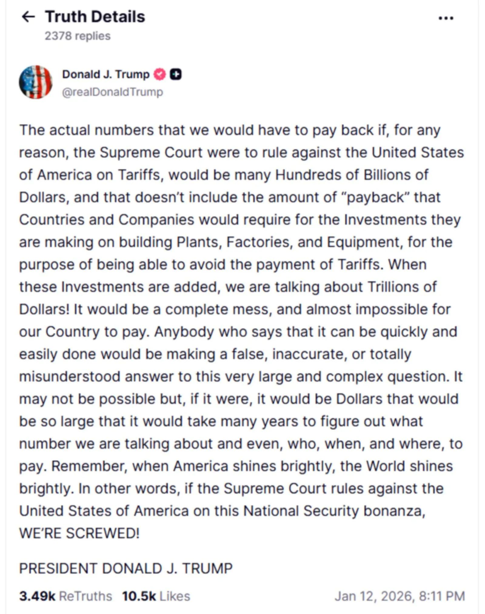 Σε μια τέτοια περίπτωση η αμερικανική κυβέρνηση θα ήταν υποχρεωμένη να αποζημιώσει «με εκατοντάδες δισεκατομμύρια δολάρια» τις αμερικανικές εταιρείες, υποστήριξε ο Τραμπ στην ανάρτησή του στην πλατφόρμα Truth Social. Και αυτό, χωρίς να υπολογίζονται όσα θα μπορούσαν να ζητήσουν χώρες και επιχειρήσεις ως αποζημίωση για «τις επενδύσεις που πραγματοποιούν για να αποφύγουν» τους δασμούς, οι οποίες ανέρχονται σε «χιλιάδες δισεκατομμύρια», όπως υποστηρίζει.