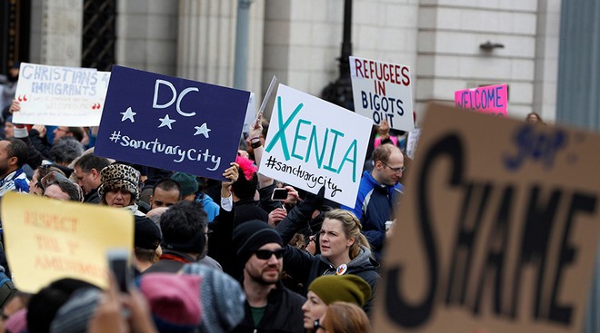 Στην Ουάσιγκτον, χιλιάδες διαδήλωσαν στο Λαφαγιέτ Σκουέρ απέναντι από τον Λευκό Οίκο, φωνάζοντας, “Όχι μίσος, όχι φόβος, οι πρόσφυγες είναι ευπρόσδεκτοι εδώ”.