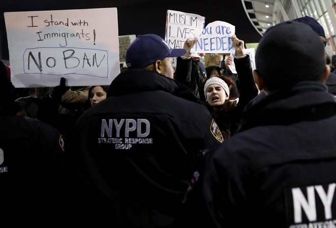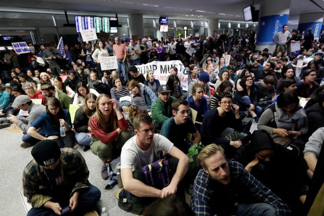 Περίπου 200 διαδηλωτές φώναζαν συνθήματα χθες το απόγευμα στο Διεθνές Αεροδρόμιο Dulles στη βόρεια Βιρτζίνια, κοντά στη Ουάσιγκτον. Ο ίδιος περίπου αριθμός ατόμων συγκεντρώθηκε στο Διεθνές Αεροδρόμιο John F. Kennedy στη Νέα Υόρκη, όπου ανήσυχα μέλη οικογενειών περίμεναν συγγενείς που είχαν βρεθεί υπό κράτηση για ώρες μετά από πτήσεις από χώρες που επηρεάζονται από την προεδρική διαταγή.