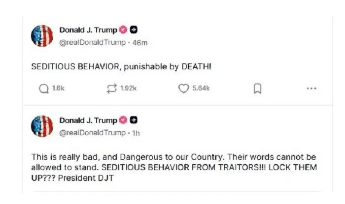 «ΣΥΜΠΕΡΙΦΟΡΑ ΣΤΑΣΙΑΣΤΩΝ, τιμωρείται με ΘΑΝΑΤΟ!» έγραψε ο Ντόναλντ Τραμπ σε ανάρτησή του στο Truth Social, αμέσως μετά την επίθεση που εξαπέλυσε κατά έξι Δημοκρατικών μελών του Κογκρέσου που κάλεσαν τις ένοπλες δυνάμεις για πολιτική ανυπακοή για εντολές της κυβέρνησης Τραμπ.