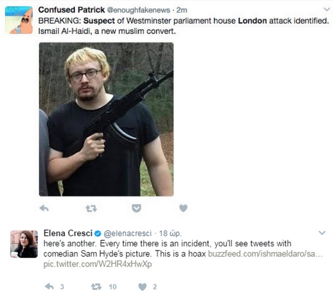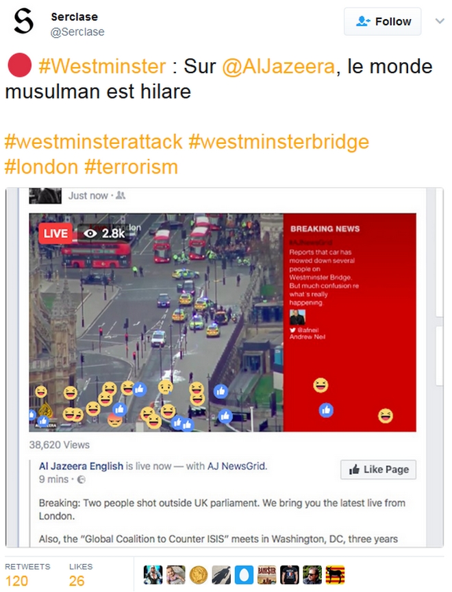 Ένα tweet του δικτύου Al Jazeera με μια φωτογραφία από το σημείο της επίθεσης στη Γέφυρα του Ουέστμινστερ προκάλεσε… γέλιο σε δεκάδες χρήστες του διαδικτύου, που πιθανώς θεώρησαν ότι πρόκειται για κάποιο είδος φάρσας… Είναι δύσκολο να διαπιστωθεί εάν το tweet του Al Jazeera και οι αντιδράσεις που απέσπασε είναι αληθινές ή προϊόν μοντάζ.