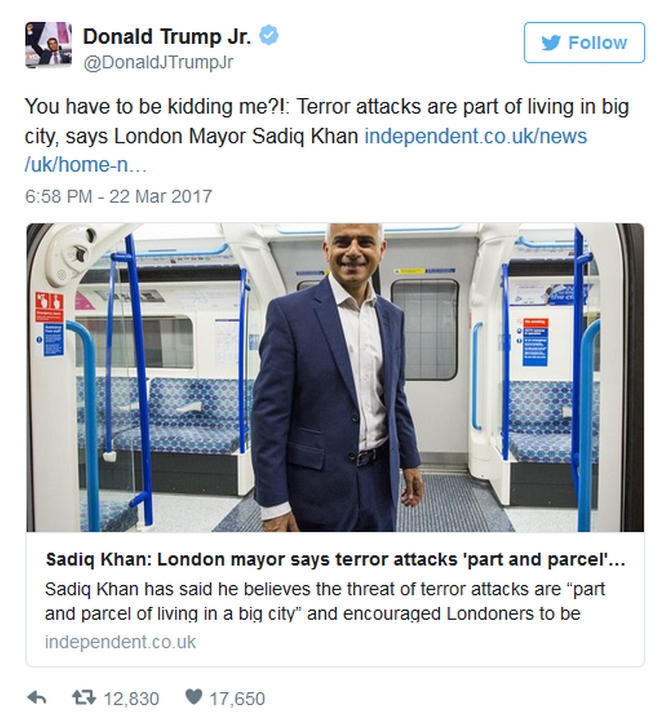 Ωστόσο την Τετάρτη, ο δημάρχος εμφανίστηκε από μερικά μέσα ενημέρωσης να δηλώνει “Οι τρομοκρατικές επιθέσεις είναι αναπόσπαστο τμήμα της ζωής στο Λονδινό”, φράση η οποία προκάλεσε έντονες αντιδράσεις. Ανάμεσα σε αυτές περιλαμβάνεται και ένα εξοργισμένο tweet του γιου του Αμερικανού προέδρου Ντόναλντ Τραμπ: