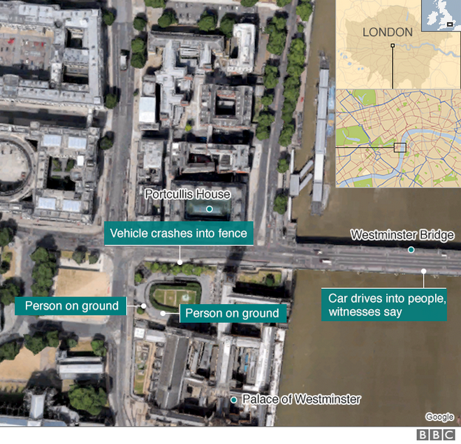 Εν μέσω πλήρους σύγχυσης, φαινόταν σαν το συμβάν να εκτυλισσόταν σε διάφορες τοποθεσίες, περιλαμβανομένης της γέφυρας του Ουεστμίνστερ, από όπου τουρίστες τραβάνε φωτογραφίες του Μπιγκ Μπεν και άλλων αξιοθέατων.