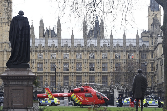An Air Ambulance on the scene after sounds similar to gunfire have been heard close to the Houses of Parliament, London, Wednesday, March 22, 2017. The UK House of Commons sitting has been suspended as witnesses report sounds like gunfire outside. (Victoria Jones/PA via AP) AP