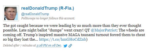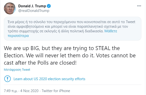 Το πρώτο εκκωφαντικό του χτύπημα έλεγε: “Είμαστε μπροστά με ΜΕΓΑΛΗ ΔΙΑΦΟΡΑ, αλλά προσπαθούν να ΚΛΕΨΟΥΝ τις εκλογές. Δεν θα αφήσουμε ποτέ να το κάνουν. Δεν μπορούν να κατατεθούν ψήφοι αφού κλείσουν τα εκλογικά τμήματα”. Άμεσά το Twitter πρόσθεσε προειδοποίηση στη δημοσίευση για παραπλανητική ανάρτηση σχετικά με την πολιτική διαδικασία.