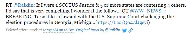 Στις 8 Ιανουαρίου του 2021, ο Τραμπ έγραψε: “Οι 75.000.000 σπουδαίοι Αμερικανοί Πατριώτες που με ψήφισαν, και ΚΑΝΟΥΝ ΤΗΝ ΑΜΕΡΙΚΗ ΜΕΓΑΛΗ ΞΑΝΑ, θα έχουν μια ΜΕΓΑΛΗ ΦΩΝΗ στο μέλλον. Δεν θα αντιμετωπίζονται άδικα”.