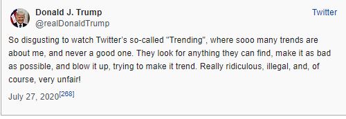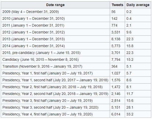 Για τη χρήση του Twitter από τον Ντόναλντ Τραμπ μπορεί κάποιος να ενημερωθεί σχολαστικά από τη Wikipedia που έχει καταγράψει όλη την πορεία του στα μέσα κοινωνικής δικτύωσης από τη στιγμή της εκλογής του μέχρι και τον περασμένο Οκτώβρη (Κορονοϊός, Εκλογές, υπόθεση Τζέφρι Έπσταϊν μέχρι και οι Linkin Park στο “ενεργητικό” του). Βέβαια, η καταγραφή δεν είναι ολοκληρωμένη, καθώς η προεκλογική περίοδος και αυτή της καταμέτρησης των ψήφων αλλά ακόμη περισσότερο αυτή που διαδέχτηκε την πανωλεθρία κατακλύστηκαν από έναν “καταιγισμό” tweets που αμφισβητούσαν το αποτέλεσμα.