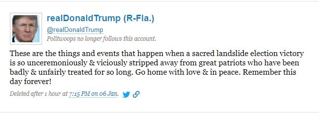 Ακόμη και μετά από την εισβολή στο Καπιτώλιο, όμως, ο Τραμπ εμφανιζόταν στο Twitter ως ηθικός θριαμβευτής, καλώντας από τη μία τους Τραμπικούς εισβολείς να “επιστρέψουν σπίτια τους”, αλλά από την άλλη να μην ξεχάσουν αυτή τη μέρα, την οποία “θα θυμόμαστε για πάντα”.