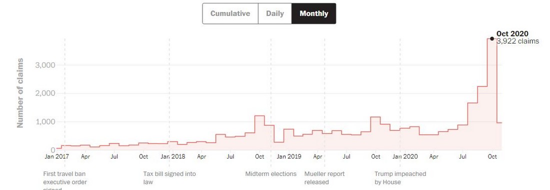 Το Τwitter ήταν μεν ένα από τα αγαπημένα βήματα δημόσιου λόγου για τον Τραμπ, αλλά όπως ήταν λογικό, δεν ήταν και το μοναδικό στο οποίο διατυμπάνιζε ακραίες, αμφιλεγόμενες και παραπλανητικές απόψεις. Η Washington Post έχει στη διάθεσή της όλα τα “πρακτικά” των δημόσιων τοποθετήσεών του, δίνοντας με συγκλονιστική λεπτομέρεια στη διάθεση του κοινού το “μαύρο κουτί” του αποτυχημένου, όπως αποδείχτηκε, λόγου του. Και εδώ βέβαια, η καταγραφή είναι ελλειμματική καθώς απουσιάζει το διάστημα της κορύφωσης “Νοεμβρίου-Ιανουαρίου”. Από το 2017 και μέχρι τον περασμένο Οκτώβριο πάντως, η Post έχει καταγράψει 29.508 ψευδείς ή παραπλανητικούς ισχυρισμούς, που αποτυπώνονται και διαγραμματικά παρακάτω: