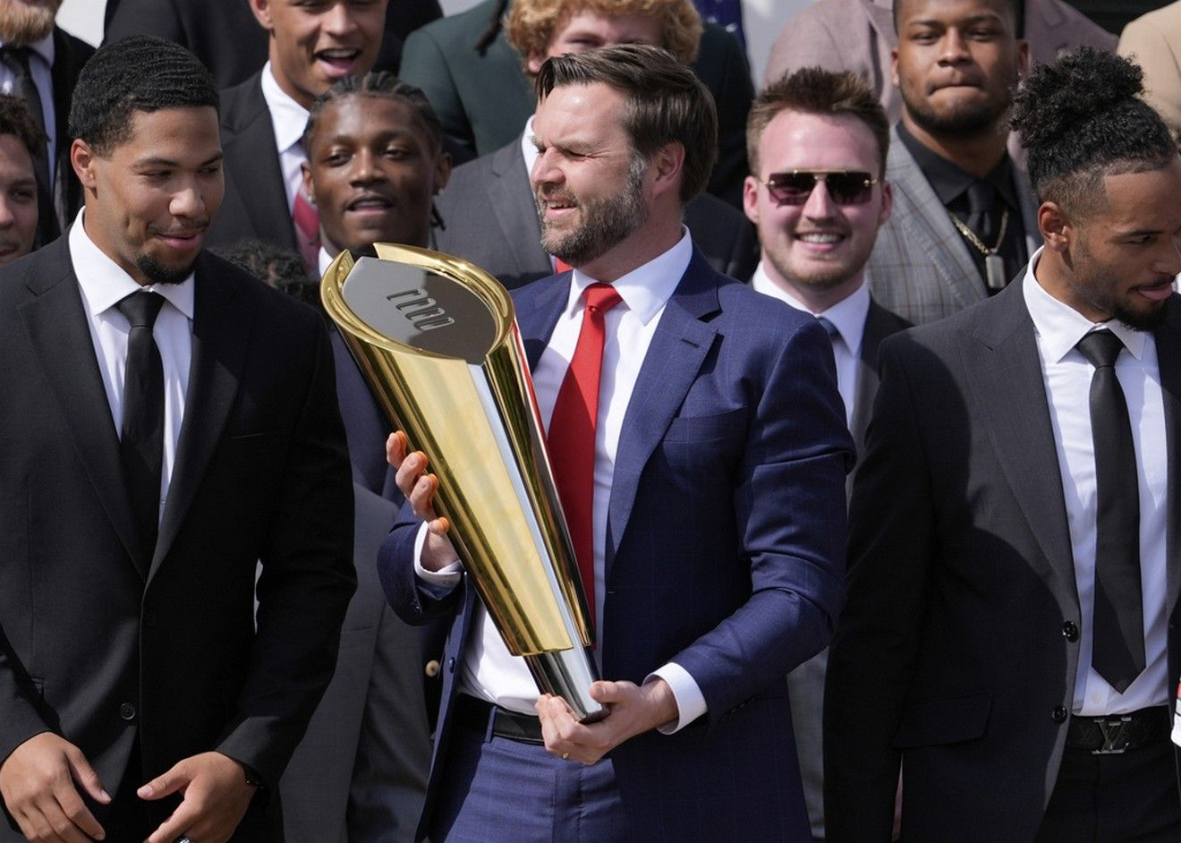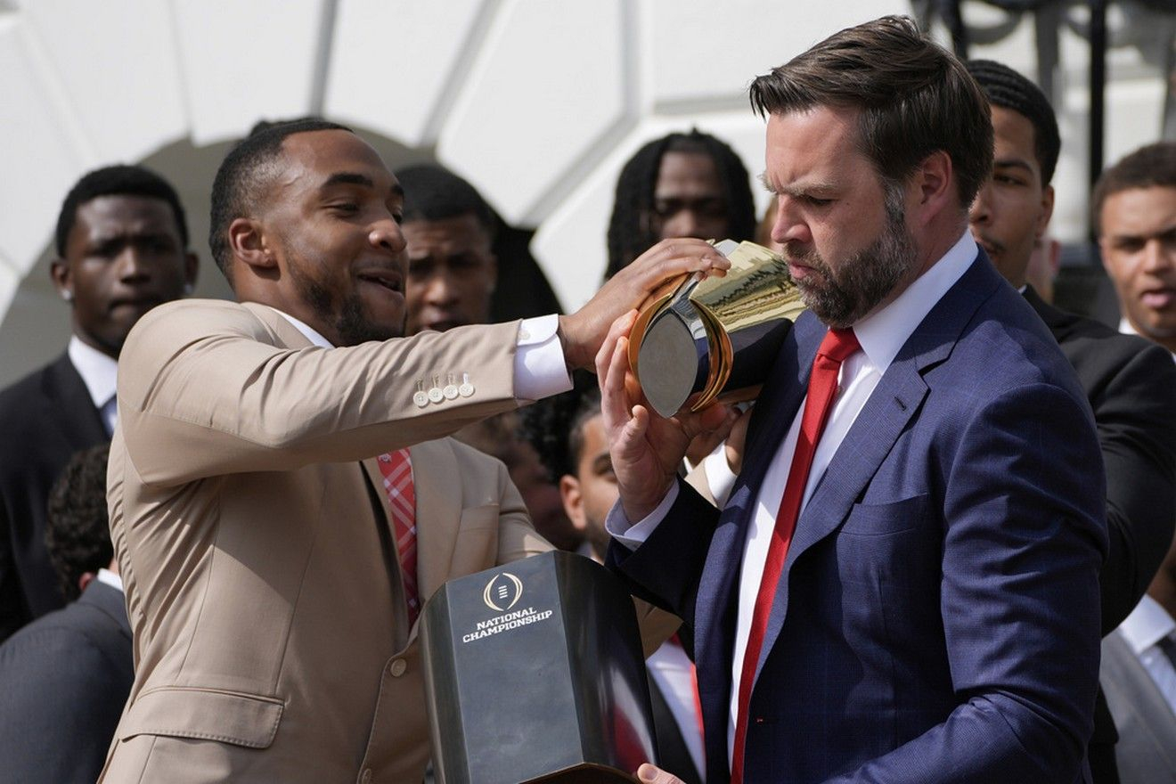 Μετά από τα εγκωμιαστικά λόγια του Ντόναλντ Τραμπ για την ομάδα του Πανεπιστημίου Οχάιο Στέιτ που κατέκτησε το εθνικό πρωτάθλημα, του προπονητή της ομάδας Μπάκαγιο Ράιαν Ντέι και του Βανς, ο αντιπρόεδρος, ο οποίος είναι απόφοιτος του Οχάιο Στέιτ, “έκλεισε” την εκδήλωση με τον πιο επεισοδιακό τρόπο, αφού στην προσπάθειά του να σηκώσει την κούπα δεν κατάλαβε ότι το πάνω μέρος του τροπαίου μπορεί να αποσπαστεί από τη βάση του, με αποτέλεσμα αυτή να πέσει στο έδαφος.