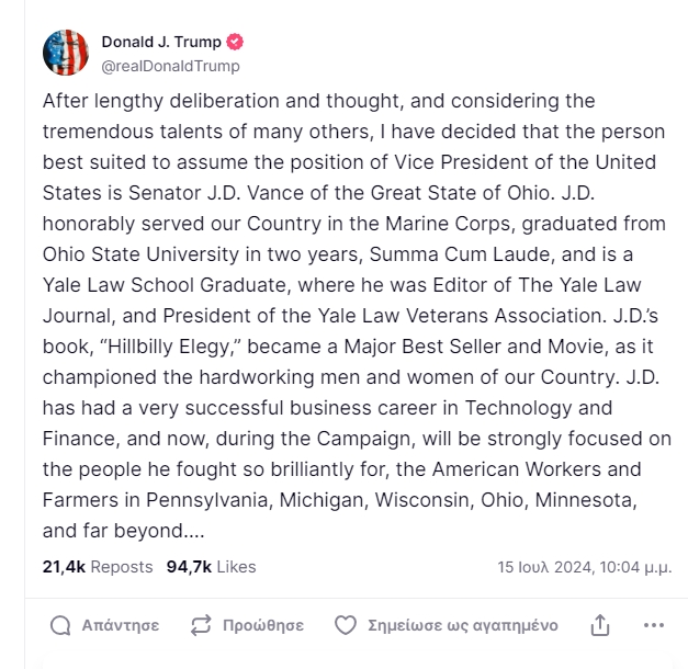 Ο Τραμπ ανακοίνωσε την επιλογή του τη Δευτέρα στην πλατφόρμα του Truth Social. “Μετά από μακρά συζήτηση και σκέψη, και λαμβάνοντας υπόψη τα τεράστια ταλέντα πολλών άλλων, αποφάσισα ότι το πρόσωπο που ταιριάζει καλύτερα στη θέση του Αντιπροέδρου των Ηνωμένων Πολιτειών είναι ο γερουσιαστής JD Vance της Μεγάλης Πολιτείας του Οχάιο”, έγραψε.
