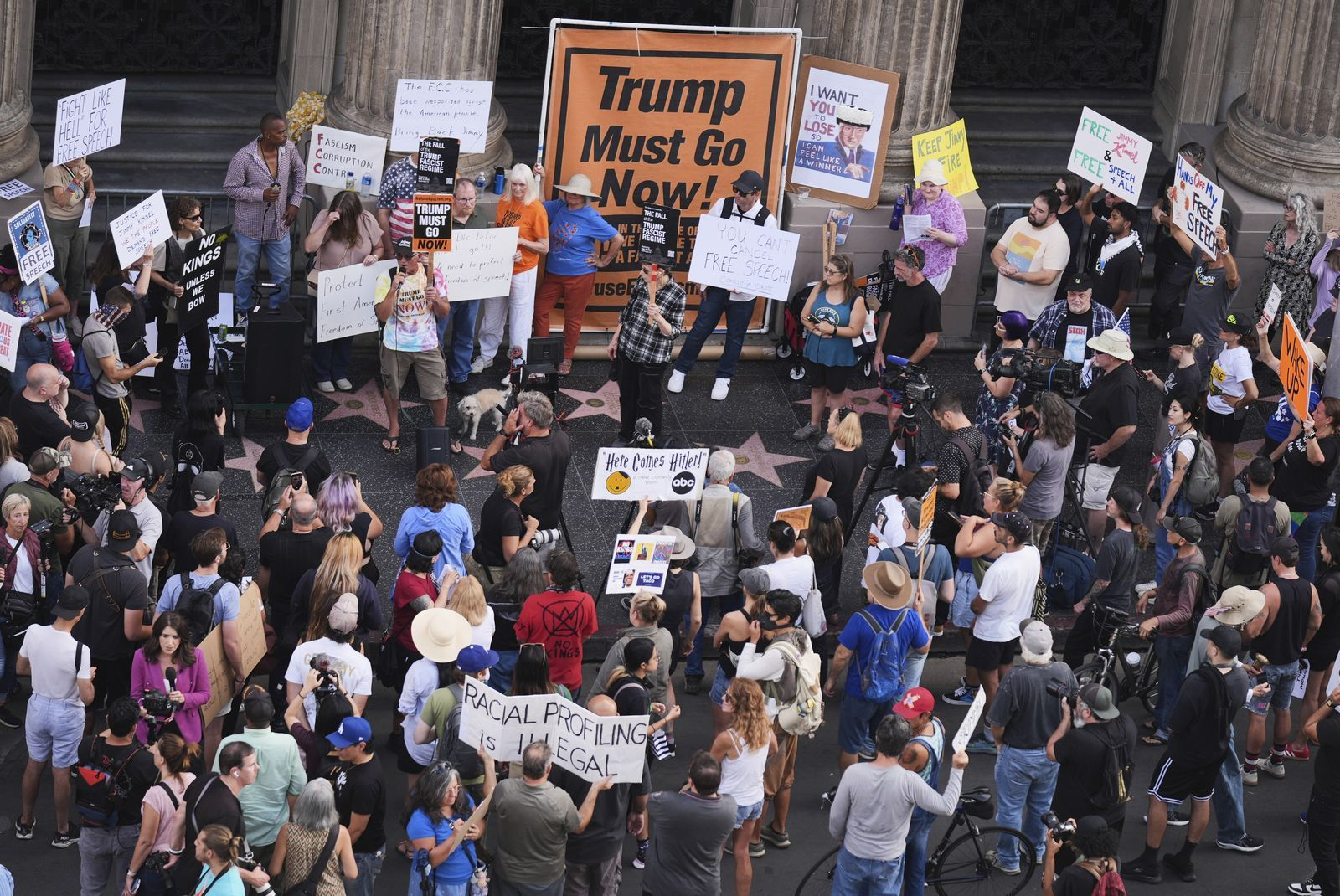 Διαδηλωτές κρατούν πλακάτ έξω από το El Capitan Entertainment Centre, όπου γυρίζεται η εκπομπή "Jimmy Kimmel Live!" 2025 Jae C. Hong/AP Photo