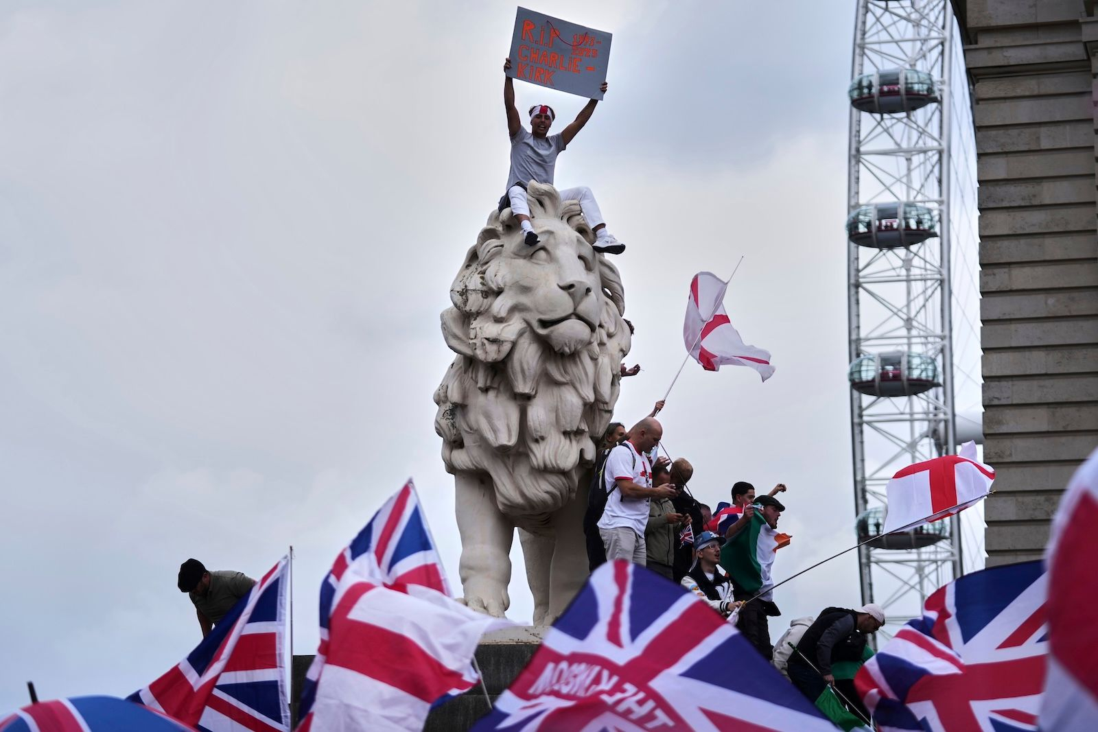 Οι κεντρικοί δρόμοι του Λονδίνου γύρω από το Waterloo γεμίσανε με σημαίες της Βρετανίας, της Αγγλίας, της Σκωτίας και της Ουαλίας, ενώ άλλοι διαδηλωτές είχαν φέρει μαζί τους σημαίες των ΗΠΑ και του Ισραήλ ή φορούσαν καπελάκια με το σύνθημα MAGA (Make America Great Again) του Αμερικανού προέδρου Ντόναλντ Τραμπ.