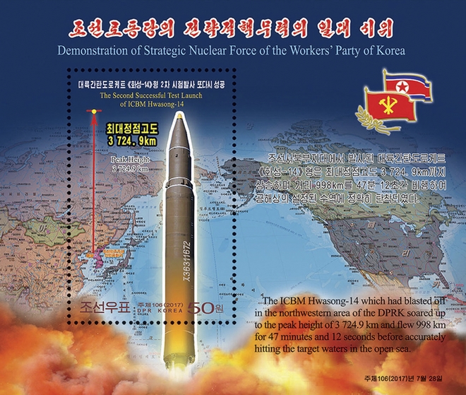 4 Ιουλίου 2017: Η Βόρεια Κορέα εκτοξεύει πύραυλο το βεληνεκές του οποίου εκτιμήθηκε στα 6.700 χιλιόμετρα, και θα μπορούσε να απειλήσει την Αλάσκα. Η Πιονγκγιάνγκ ανακοίνωσε την «ιστορική» δοκιμή του Hwasong-14, ο οποίος παρουσιάστηκε ως διηπειρωτικός βαλλιστικός πύραυλος.
