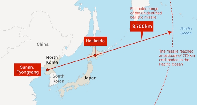Ο πύραυλος πέρασε πάνω από τη νήσο Χοκάιντο και ενεργοποιήθηκε το σύστημα έγκαιρης προειδοποίησης J-Alert σε πολλές περιοχές στο βόρειο τμήμα του αρχιπελάγους.