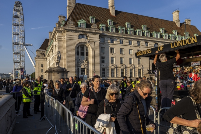 Στη συντριπτική τους πλειονότητα, όσοι περιμένουν υπομονετικά επί ώρες για να βρεθούν κοντά στο βασιλικό φέρετρο είναι Βρετανοί. Ωστόσο, ορισμένοι είναι τουρίστες που βρίσκονταν στο Λονδίνο σε αυτήν την ιστορική συγκυρία. Αντικρίζει κανείς ακόμη και μωρά στην αγκαλιά των γονιών τους.
