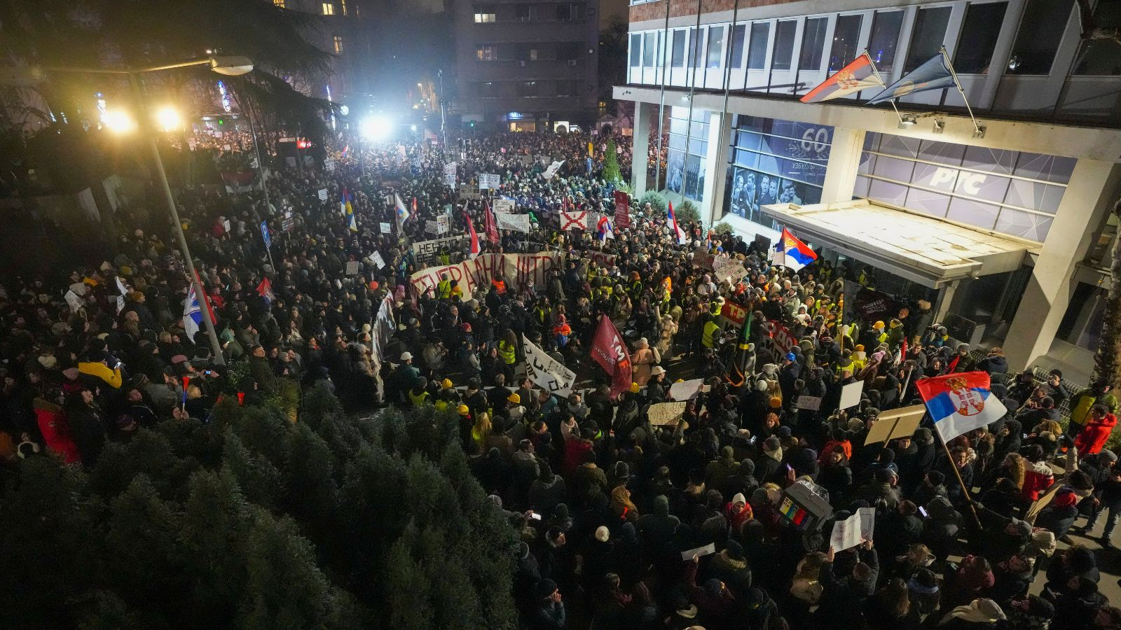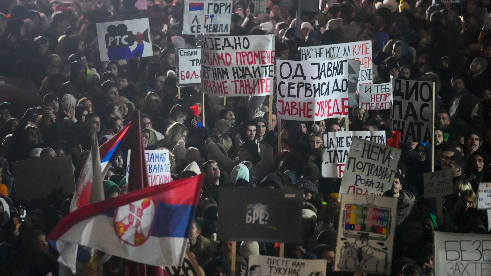 Δεκάδες χιλιάδες διαδηλωτές, το βράδυ της Παρασκευής (17/1), στάθηκαν σιωπηλοί για 15 λεπτά μπροστά από το κτίριο της κρατικής τηλεόρασης RTS στο Βελιγράδι, τιμώντας τα θύματα της τραγωδία στον σιδηροδρομικό σταθμό του Νόβι Σαντ.