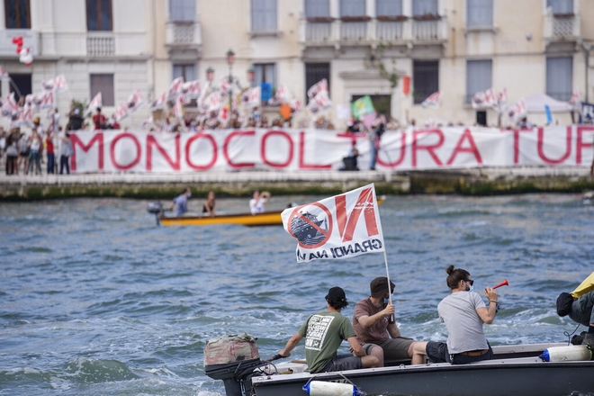 Με βάρκες και σημαίες οι κάτοικοι της Βενετίας διαμαρτυρήθηκαν για την επιστροφή των κρουαζιερόπλοιων στη λιμνοθάλασσα μετά απο 17 μήνες.