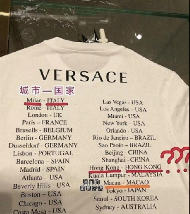 Η ιταλική εταιρεία Versace βρέθηκε στο στόχαστρο την Κυριακή για μια κοντομάνικη μπλούζα που κυκλοφόρησε στην οποία αναφέρονται κάποιες πόλεις μαζί με τη χώρα στην οποία ανήκουν, όπως για παράδειγμα “Παρίσι – ΓΑΛΛΙΑ” και “Σανγκάη – ΚΙΝΑ”.