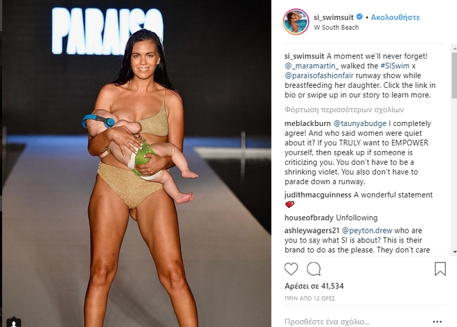 Το “Sports Illustrated” πάντως αποθέωσε την εμφάνιση της Μάρτιν υποστηρίζοντας με αυτόν τον τρόπο το δικαίωμα της κάθε γυναίκας να θηλάζει το παιδί της όποτε και όπου χρειάζεται.