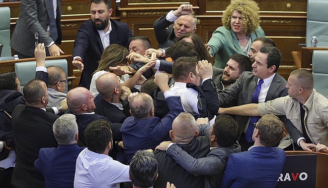 Σκηνές απείρου κάλλους εκτυλίχθηκαν -για ακόμη μια φορά, στο κοινοβούλιο του Κοσόβου όταν βουλευτές της συμπολίτευσης και της αντιπολίτευσης ήρθαν στα χέρια, την ώρα που στο βήμα βρισκόταν ο πρωθυπουργός.