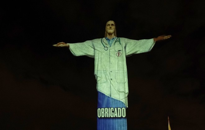 Το Άγαλμα του Χριστού Λυτρωτή στο Ρίο ντε Τζανέιρο της Βραζιλίας φωτίστηκε με πορτραίτα εργαζομένων στον τομέα της υγειονομικής περίθαλψης ως απόδοση φόρου τιμής σε όσους διακινδυνεύουν καθημερινά τη ζωή τους για να βοηθήσουν τους συνανθρώπους τους κατά την περίοδο της πανδημίας του κορονοϊού.