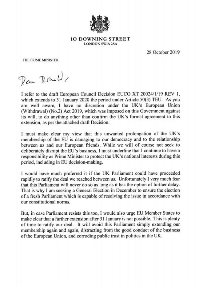 “Δεν έχω καμία διακριτική ευχέρεια βάσει της πράξης νομοθετικού περιεχομένου European Union (Withdrawal) (No. 2) Act 2019, που επιβλήθηκε σε αυτήν την κυβέρνηση παρά τη θέλησή της, να κάνω κάτι άλλο παρά να επιβεβαιώσω την επίσημη συμφωνία της Βρετανίας στην παράταση” λέει ο Τζόνσον σε μια επιστολή προς τον πρόεδρο του Ευρωπαϊκού Συμβουλίου Ντόναλντ Τουσκ.