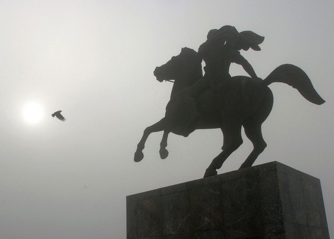 Fog descends on the statue of the Alexander the Great in the northern Greek port city of Thessaloniki, on Friday, Dec. 3, 2004. Movie Director Oliver Stone's film about the ancient warrior who vanquished most of the known world before turning 30, "Alexander" was set to open in cinemas in Greece on Friday, an epic starring Colin Farrell as Alexander and Val Kilmer and Angelina Jolie as his parents. (AP Photo/Nikolas Giakoumidis) AP
