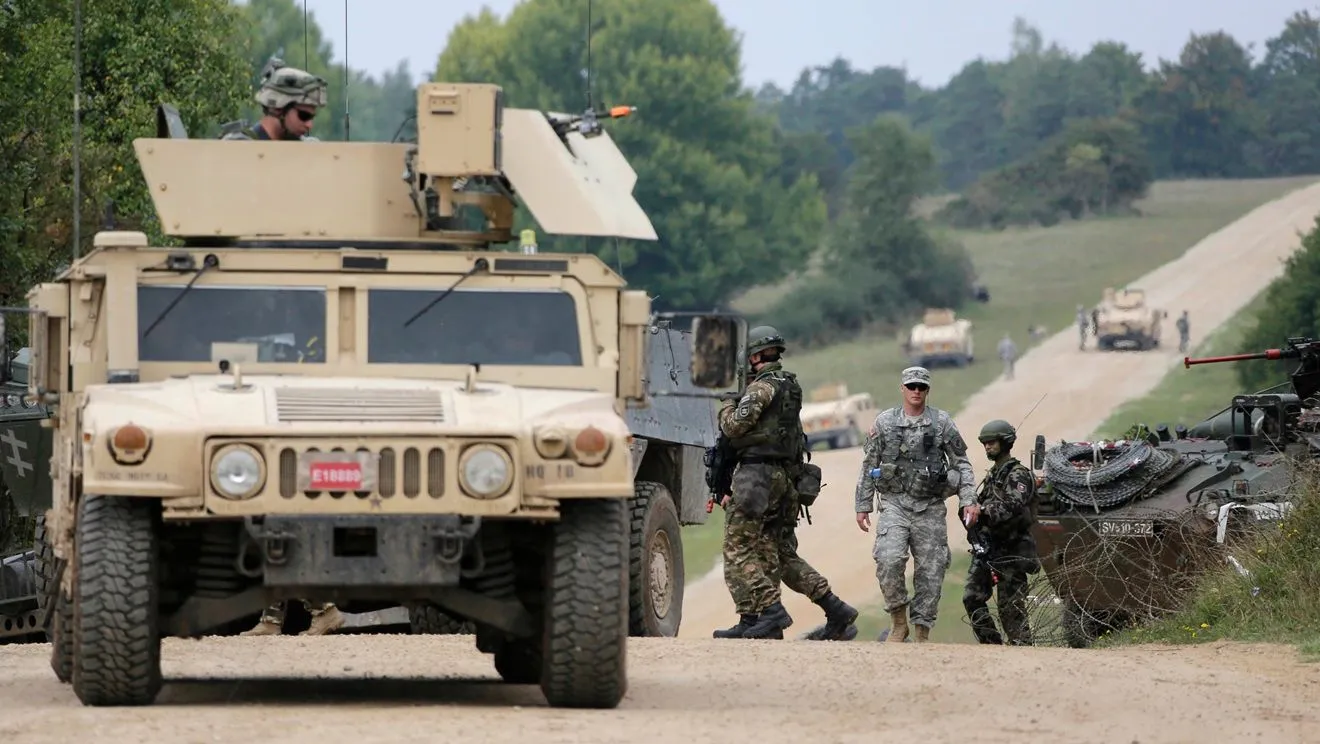 Soldiers from NATO countries take part in an exercise called "Saber Junction" at the military area in Hohenfels near Regensburg, southern Germany, Monday, Sept. 8, 2014. Saber Junction 14 is a U.S. Army Europe led, U.S. European Command directed, multinational, multiservice exercise that involves more than 5,800 personnel from 17 European countries. (AP Photo/Matthias Schrader)