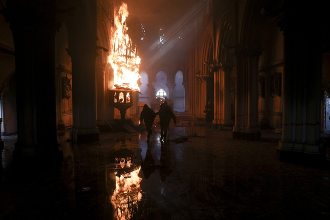 Μια εκκλησία λεηλατήθηκε και πυρπολήθηκε στην αρχή, όμως η φωτιά τέθηκε σύντομα υπό έλεγχο από τις πυροσβεστικές δυνάμεις. Ένας δεύτερος ναός, σε πολύ κοντινή απόσταση, καταστράφηκε ολοσχερώς από τις φλόγες. «Να πέσει! Να πέσει!», φώναζαν ομάδες διαδηλωτών, που είχαν τα πρόσωπά τους καλυμμένα.