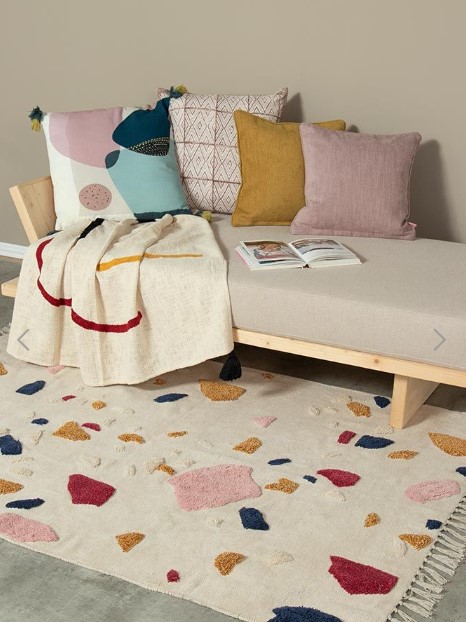 Χειροποίητο χαλί Symmetry Living Terrazzo σε μωσαϊκό ανάγλυφο σχέδιο σε natural φόντο που χαρίζει ποικιλία χρωμάτων. Κατασκευασμένο με την παραδοσιακή τεχνική hand-tufted που χάρη στον σχεδιασμό του ταιριάζει σε πολλά στυλ διακόσμησης. Στο καθιστικό σας στολίστε το χειροποίητο χαλί με ένα μουσταρδί, γκρι ή μπλε μονόχρωμο ριχτάρι και τα διακοσμητικά μαξιλάρια Senecio και Josette που θα δώσουν μια μοντέρνα designer trend ατμόσφαιρα.