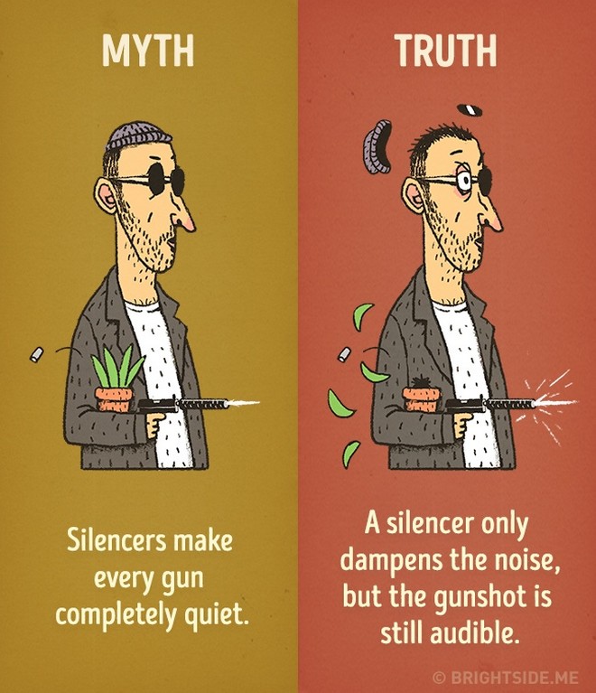 Οι σιγαστήρες κάνουν τα όπλα αθόρυβα. Στην πραγματικότητα οι σιγαστήρες μειώνουν τον θόρυβο που κάνουν τα όπλα, αλλά δεν τον εξαφανίζουν, με αποτέλεσμα ο πυροβολισμός να παραμένει αισθητός.