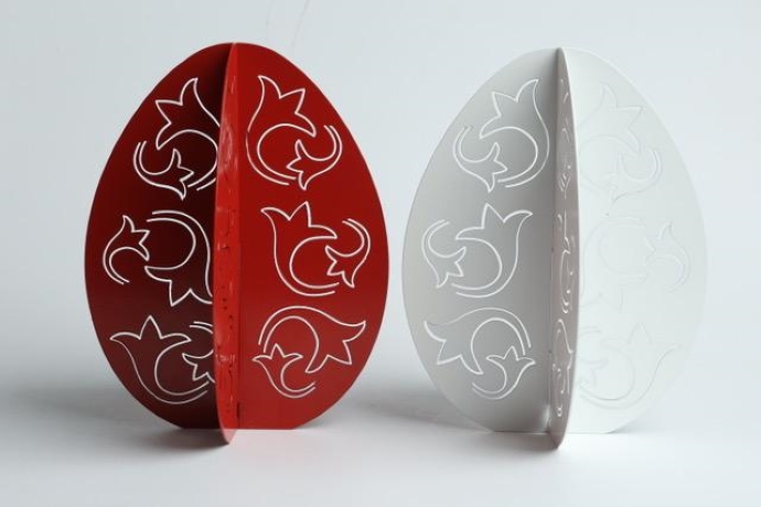 Επιτραπέζιο μεταλλικό αβγό, της R Design, με εγχάρακτo διάτρητο μοτίβο, εμπνευσμένο από μαρμάρινο φεγγίτη από τις συλλογές του Μουσείου Μαρμαροτεχνίας στην Τήνο.