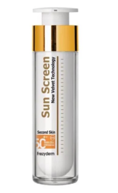 H Frezyderm sun Screen velvet face παρέχει μια πρωτοποριακή διάφανη αντηλιακή προστασία προσώπου με μοναδική καλλυντική συμπεριφορά και άριστη εφαρμογή μ’ ένα άγγιγμα. Χάρη στην επαναστατική καινοτομία Second Skin Technology η μοναδική σύνθεσή του αφήνει μια βελούδινη αίσθηση στην επιδερμίδα, προσφέρει ματ όψη για 6 ώρες απορροφώντας το σμήγμα και απαλύνει την όψη των ρυτίδων. Η διάφανη, μη λιπαρή υφή του δεν αφήνει λευκή χροιά και το καθιστά άριστη βάση για μακιγιάζ. Προλαμβάνει τα σημάδια της φωτογήρανσης και προστατεύει από δυσχρωμίες που δημιουργούνται από την έκθεση στον ήλιο. – Βελούδινη αίσθηση – Ματ όψη για 6 ώρες, απορροφώντας τη λιπαρότητα και το σμήγμα – Απάλυνση της όψης των ρυτίδων – Δεν αφήνει λευκή χροιά – Ανθεκτικότητα στο νερό – Επιτρέπει στο δέρμα να αναπνέει – Μη λιπαρή υφή. Δερματολογικά ελεγμένο