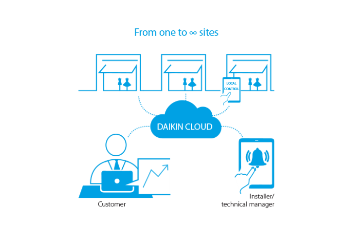 Η υπηρεσία Daikin Cloud σου επιτρέπει να διαχειρίζεσαι πολλαπλές τοποθεσίες από οποιαδήποτε θέση, κάτι που μπορεί να φανεί ιδιαίτερα χρήσιμο ειδικά σε περιπτώσεις αλυσίδων καταστημάτων με κεντρικό έλεγχο. Μέσω του Daikin Cloud μπορείς να παρακολουθείς την κατανάλωση ενέργειας, να έχεις πρόσβαση σε απομακρυσμένη υπηρεσία διάγνωσης και αρχικής αντιμετώπισης τυχόν προβλημάτων καθώς σε και προληπτική συντήρηση, για αύξηση της διάρκειας ζωής του συστήματος.