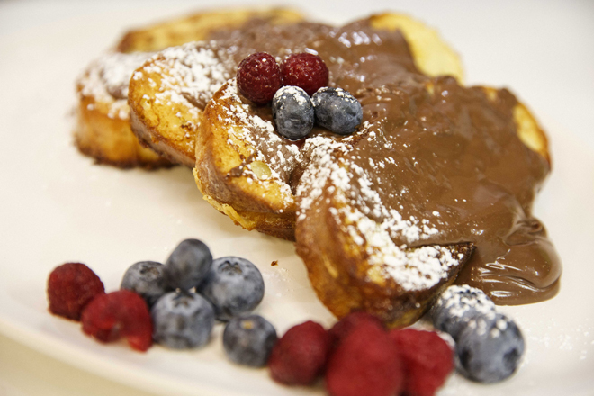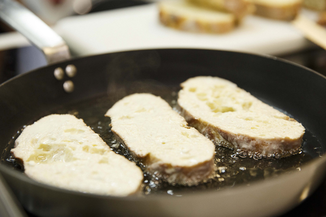 Στη συνέχεια μεταφέρετε τις φέτες στο τηγάνι και τηγανίζετε και από τις δύο πλευρές, σε μέτρια φωτιά. Γαρνίρετε με πραλίνα και mix berries.