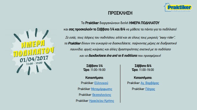 Τα Praktiker διοργανώνουν διπλή ΗΜΕΡΑ ΠΟΔΗΛΑΤΟΥ και σας προσκαλούν το Σάββατο 1/4 και 8/4 να μάθετε τα πάντα για το ποδήλατο!