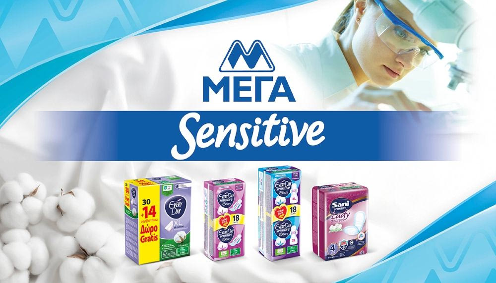 Σε αυτό το πλαίσιο γεννήθηκε και εξελίχθηκε το «Sensitive Concept», μια ελληνική καινοτομία που καθόρισε νέα πρότυπα στην προσωπική υγιεινή σε διεθνές επίπεδο. Το 1997, η ΜΕΓΑ παρουσίασε την πρώτη παγκοσμίως «Sensitive» σερβιέτα με υφασμάτινο κάλυμμα, εισάγοντας μια νέα φιλοσοφία προϊόντος βασισμένη στη φιλικότητα της το δέρμα και την αποδεδειγμένη προϊοντική ασφάλεια.